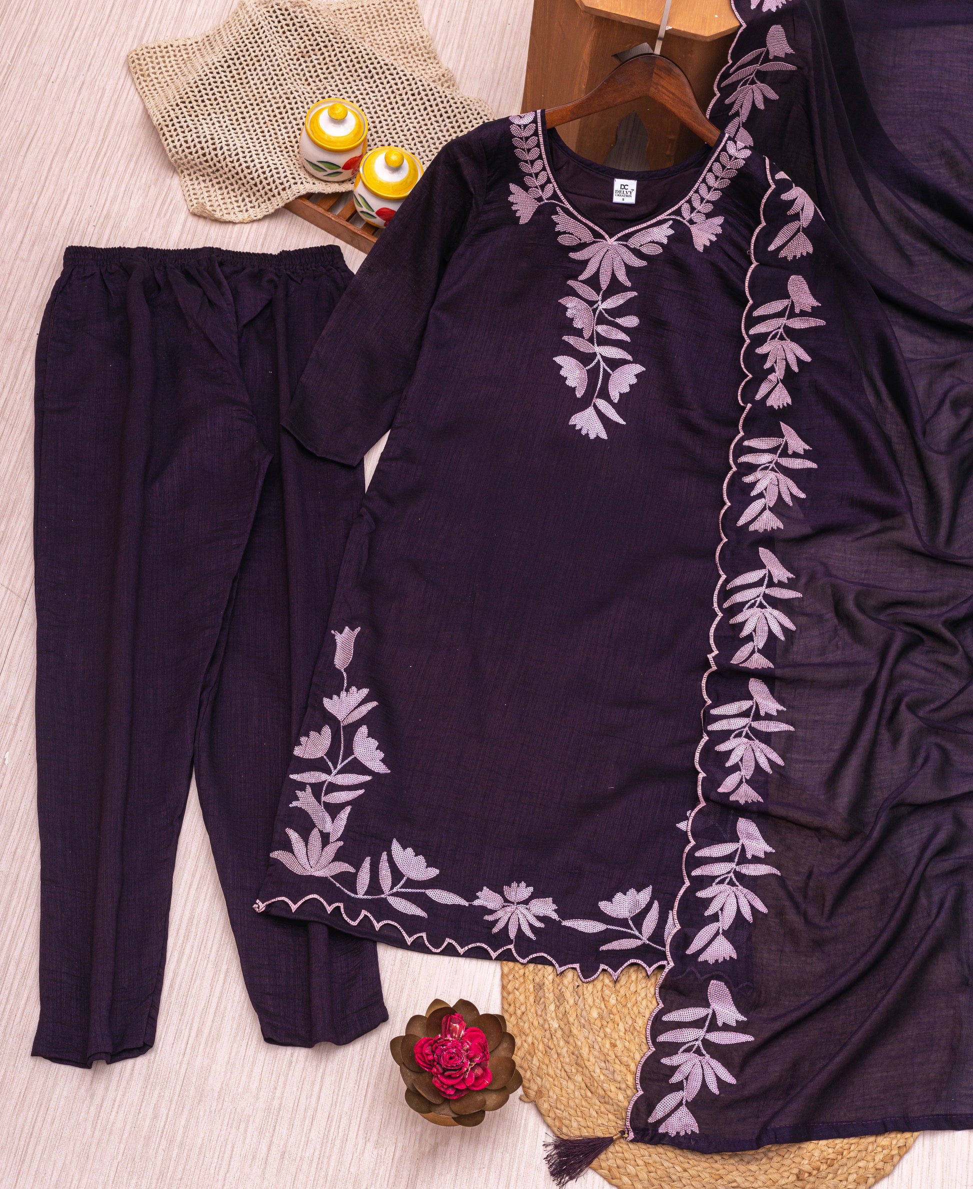 Description: Moonlit threads run across a silk-cotton canvas, framed by an ethereal organza dupatta, creating a piece as poetic as a courtyard under full moonlight.