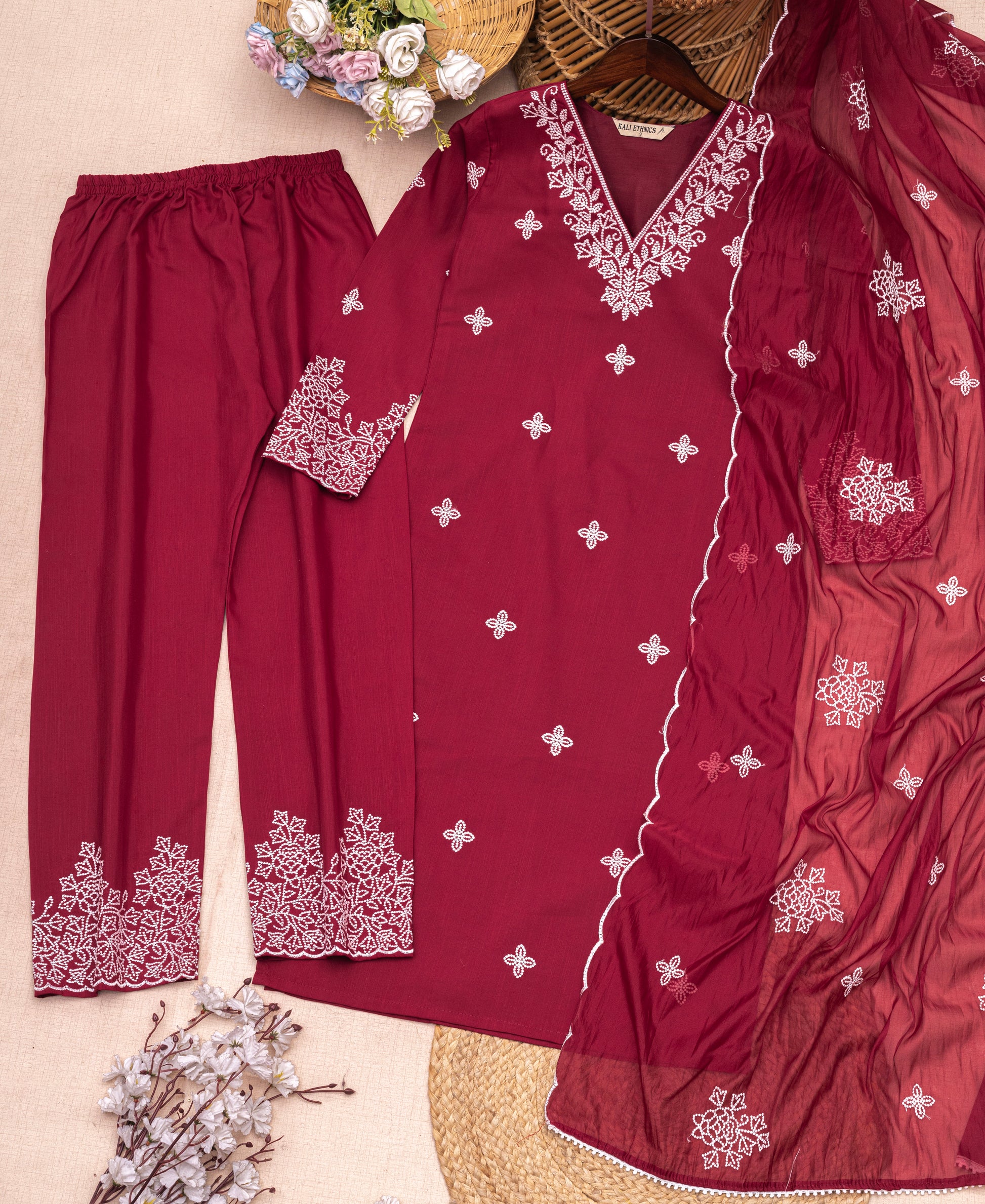 Description: Soft silk blend, airy organza, and hand embroidery come together in a design that embraces with warmth and timeless charm.
