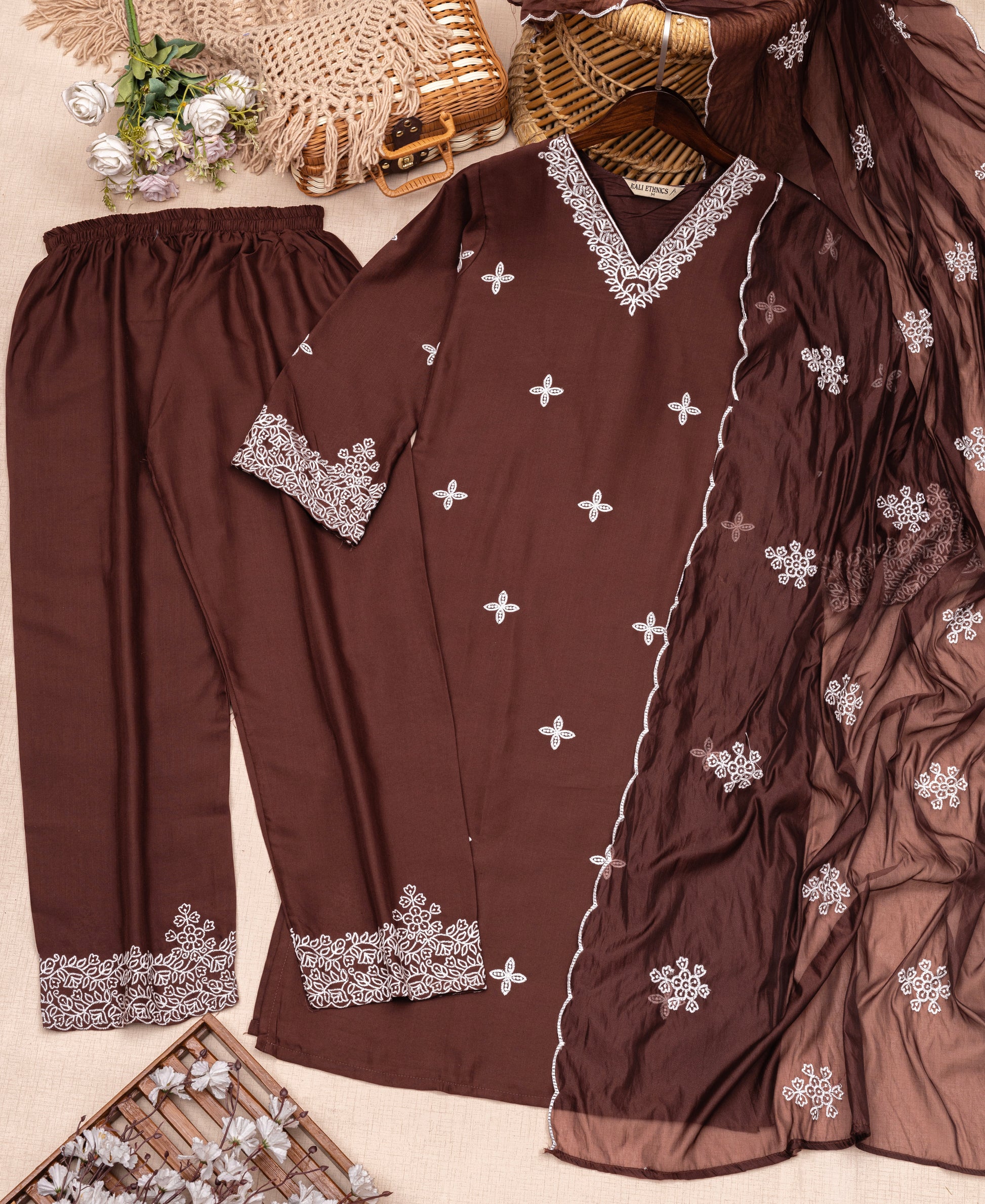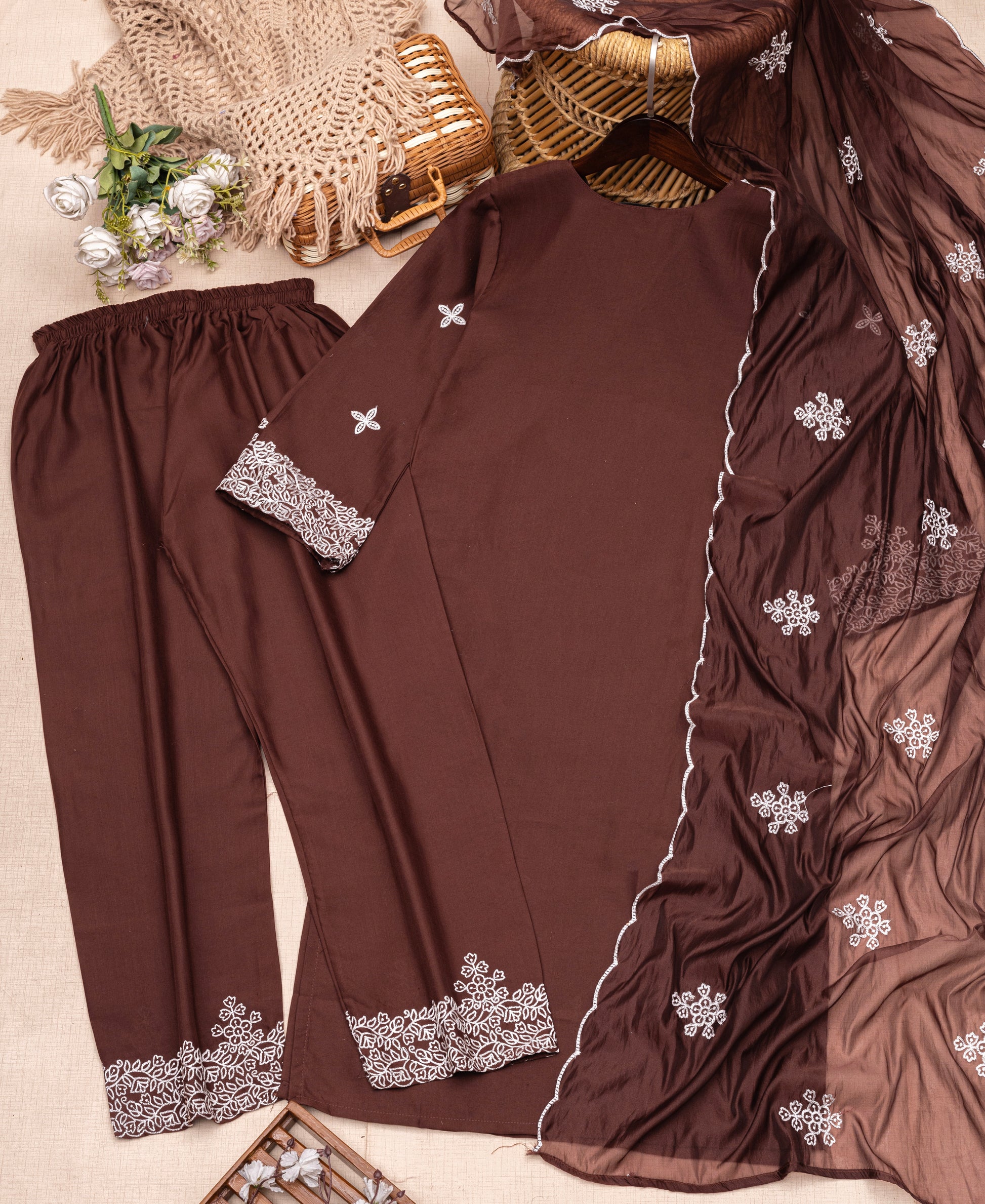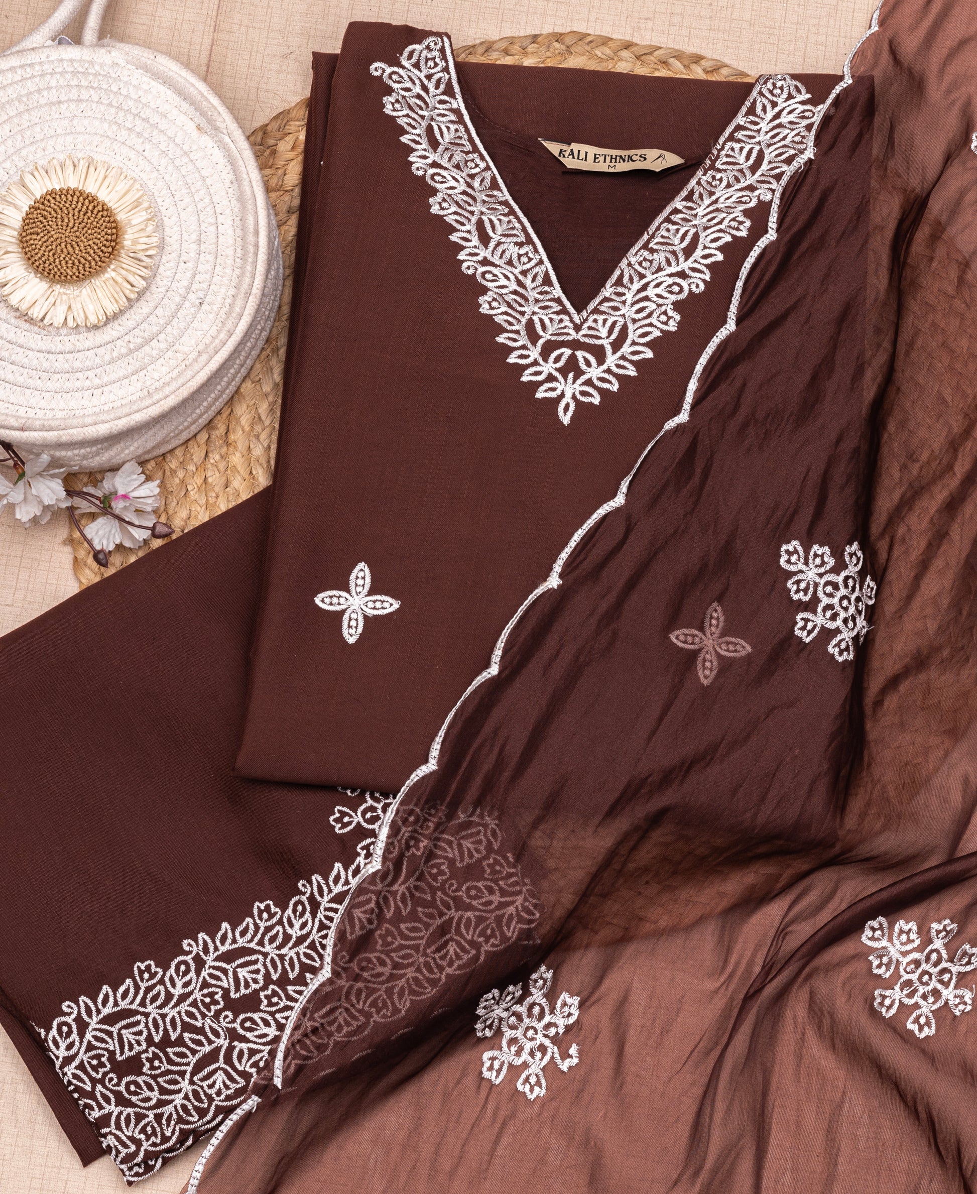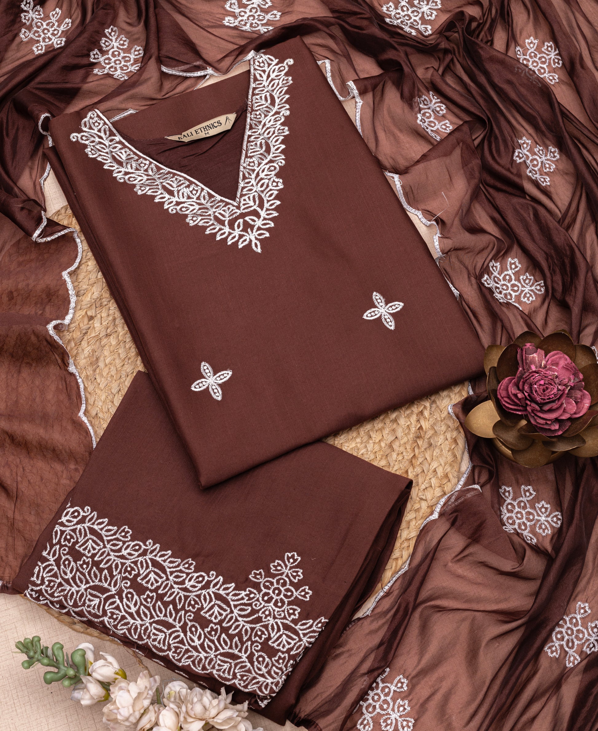 Description: A bouquet of craftsmanship, this silk blend ensemble is brought to life with hand-embroidered detail. The Organza dupatta adds a graceful, sheer finish.