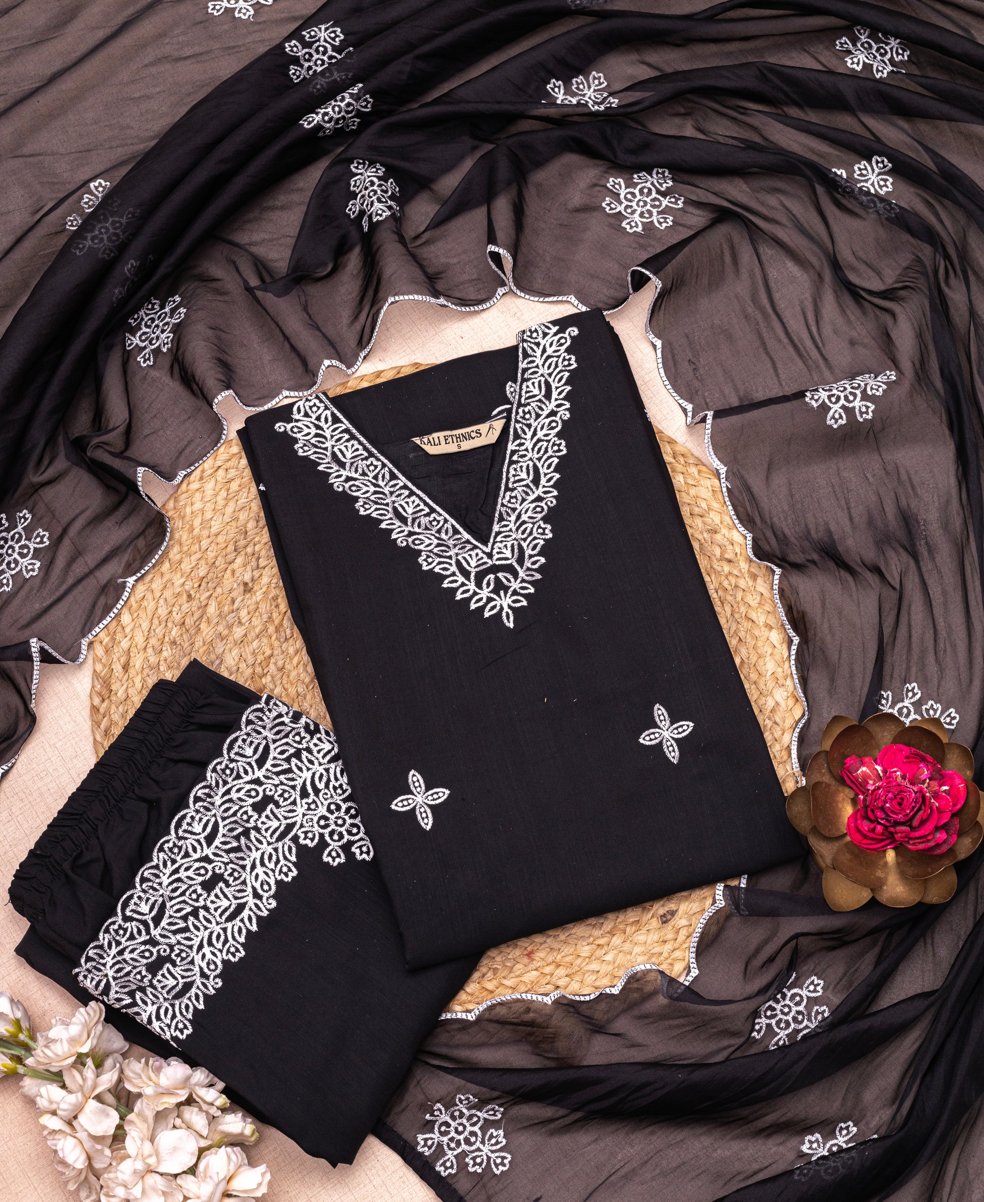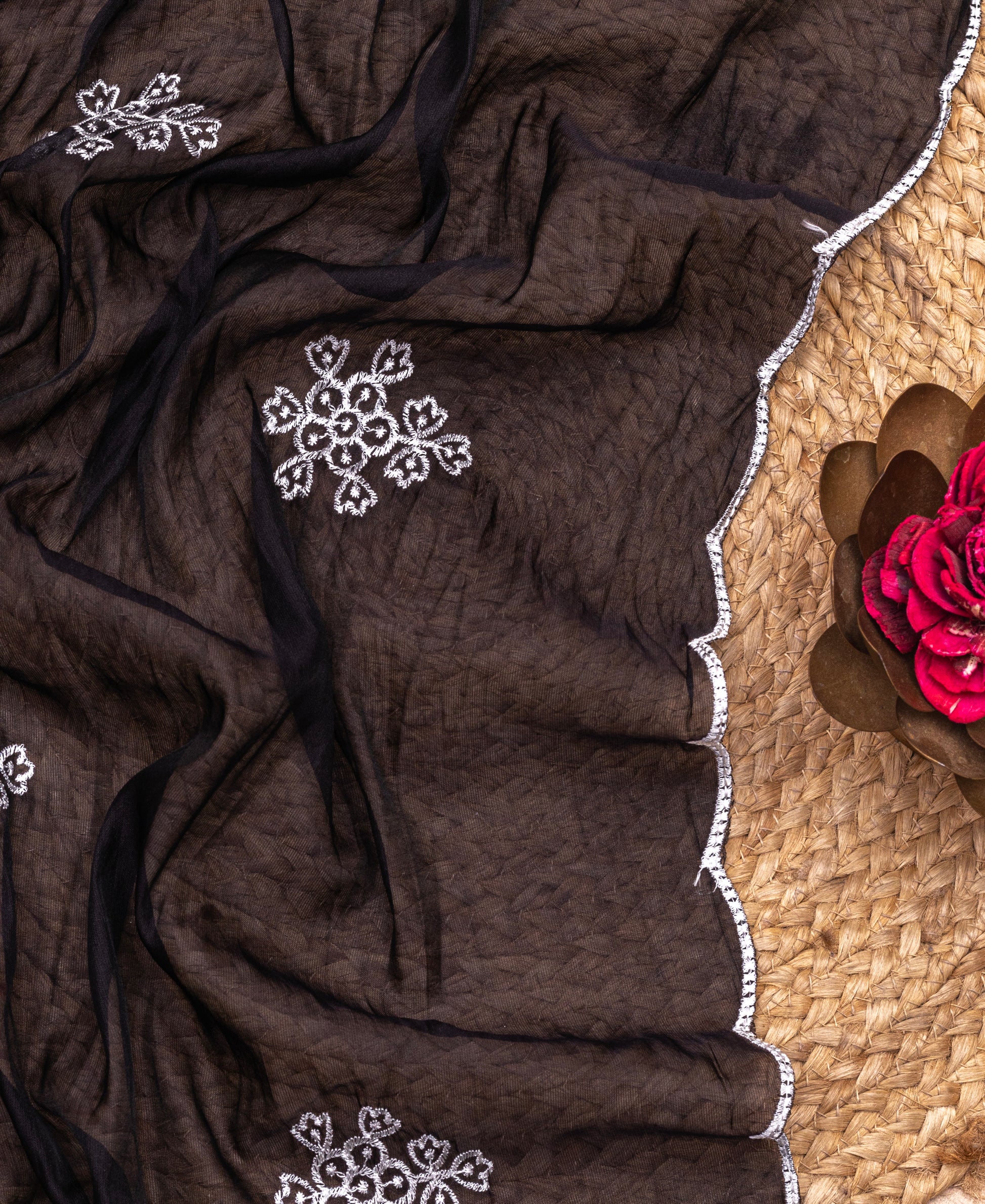Description: The elegance of a lotus stem brought to fabric — a silk blend creation detailed with embroidery and paired with a diaphanous Organza dupatta.
