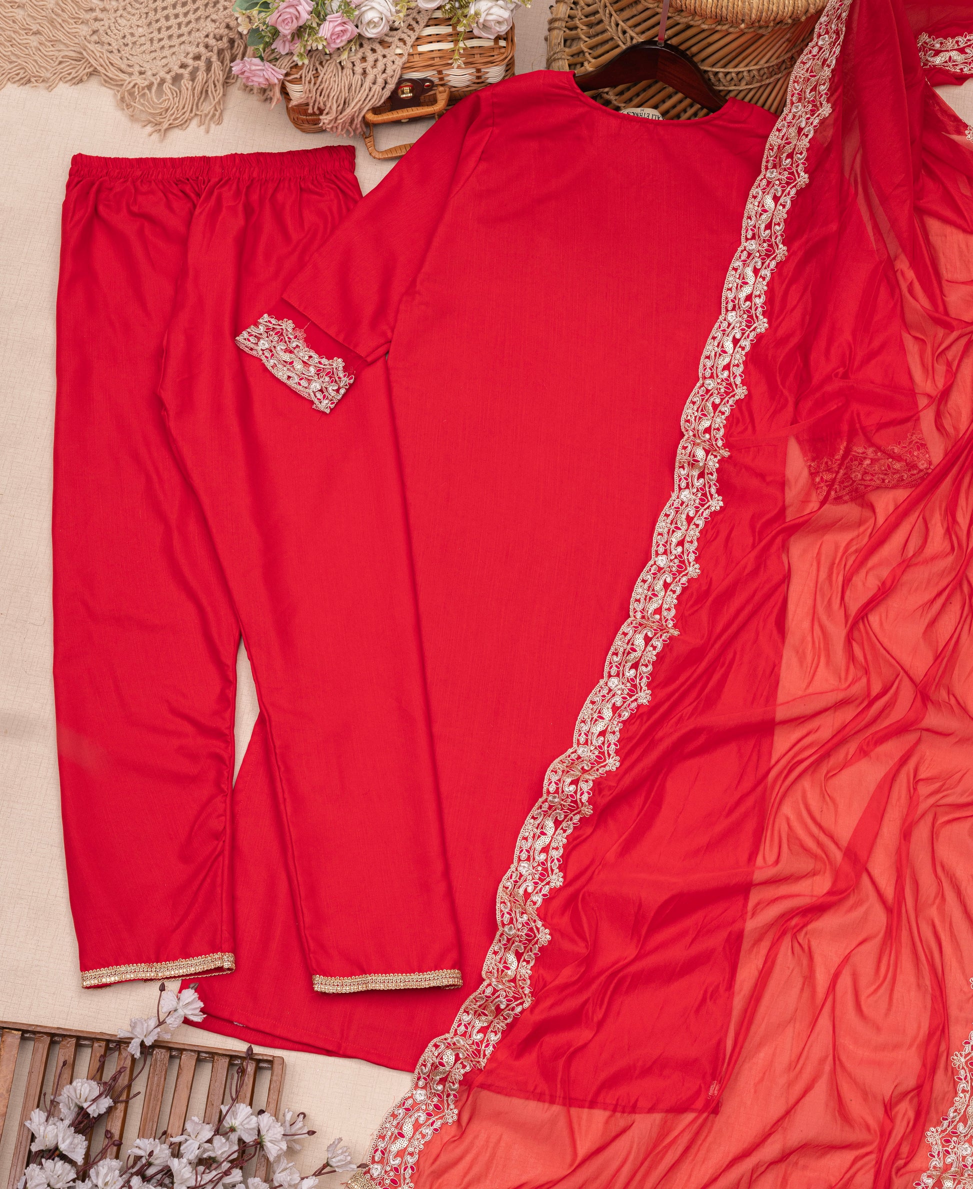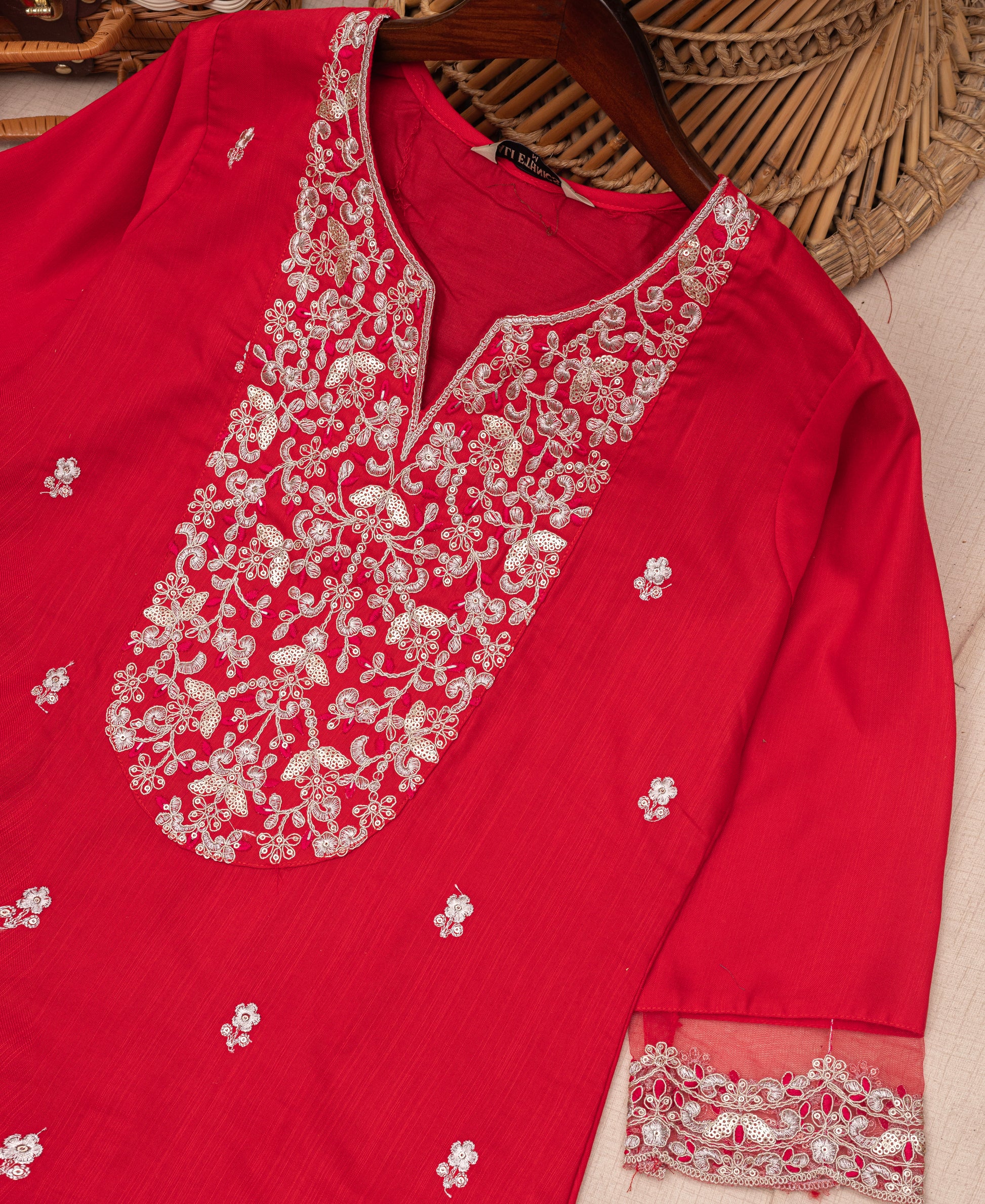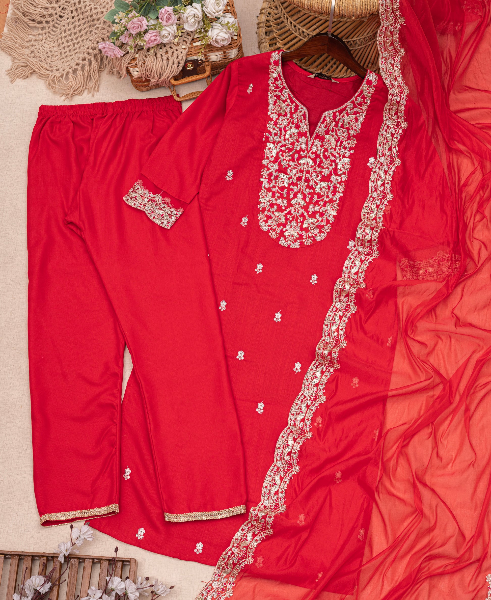 Description: Draped in light yet rich in detail, this piece glows with the quiet shimmer of silk and the softness of cotton, crowned by an airy organza dupatta.