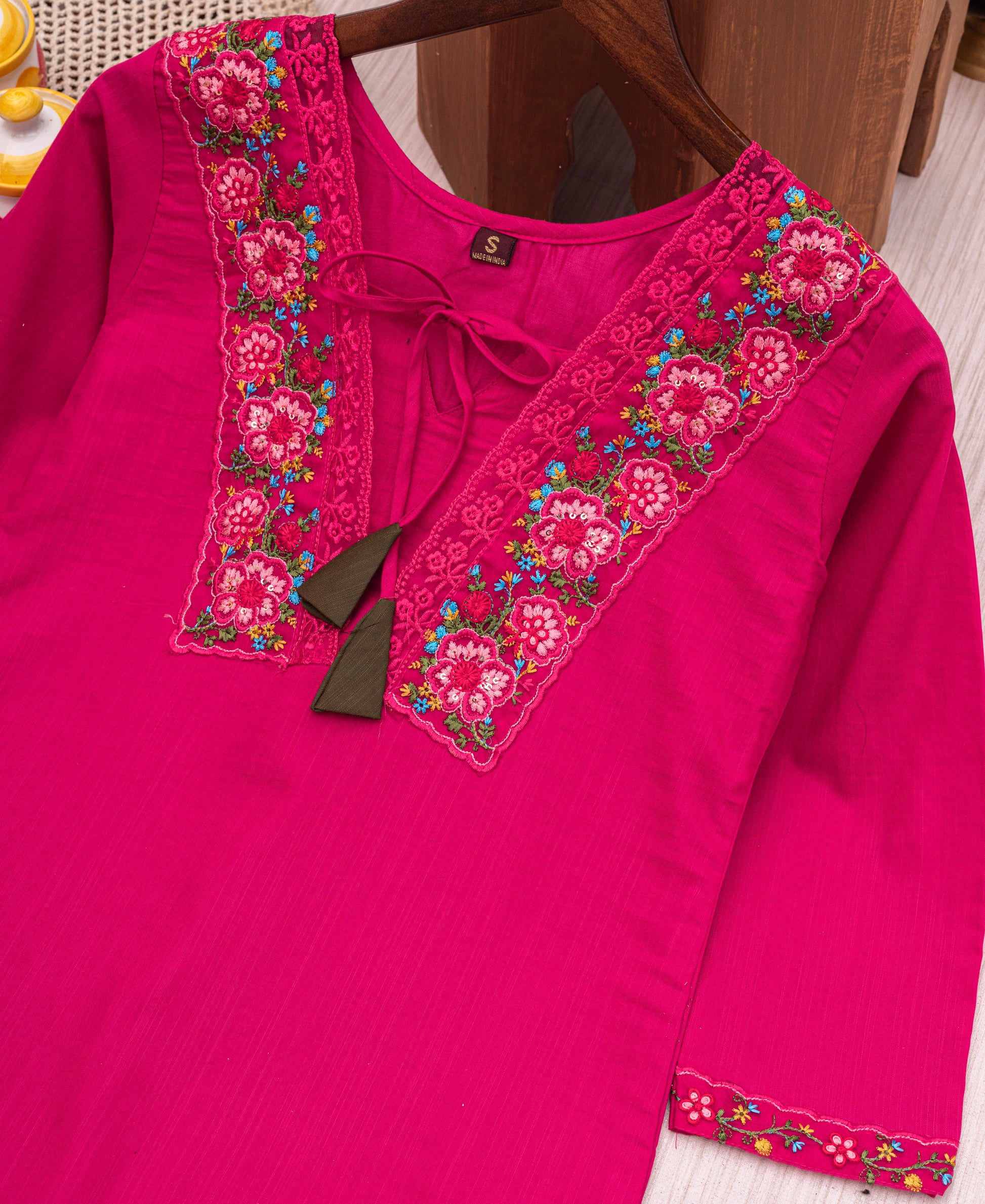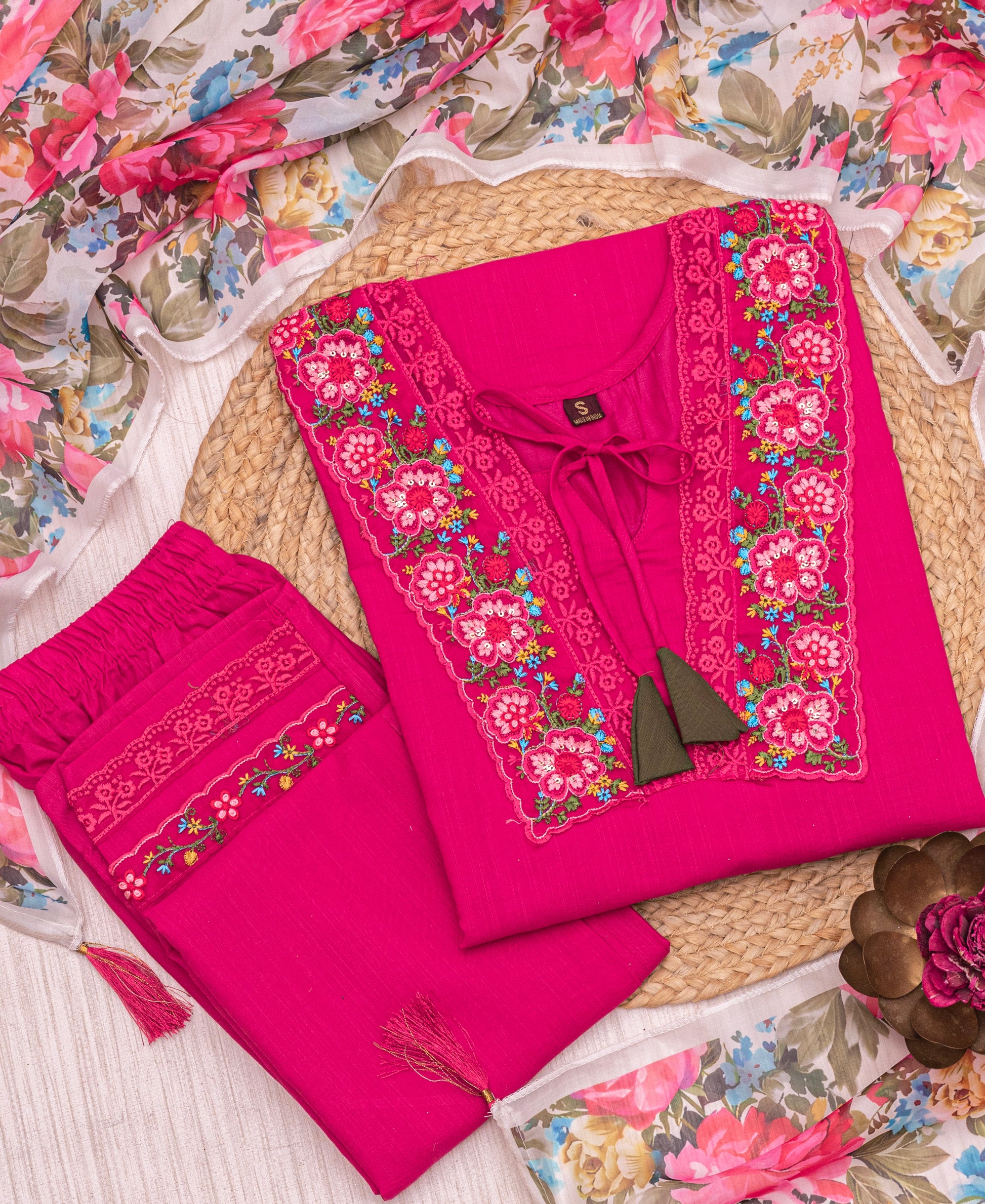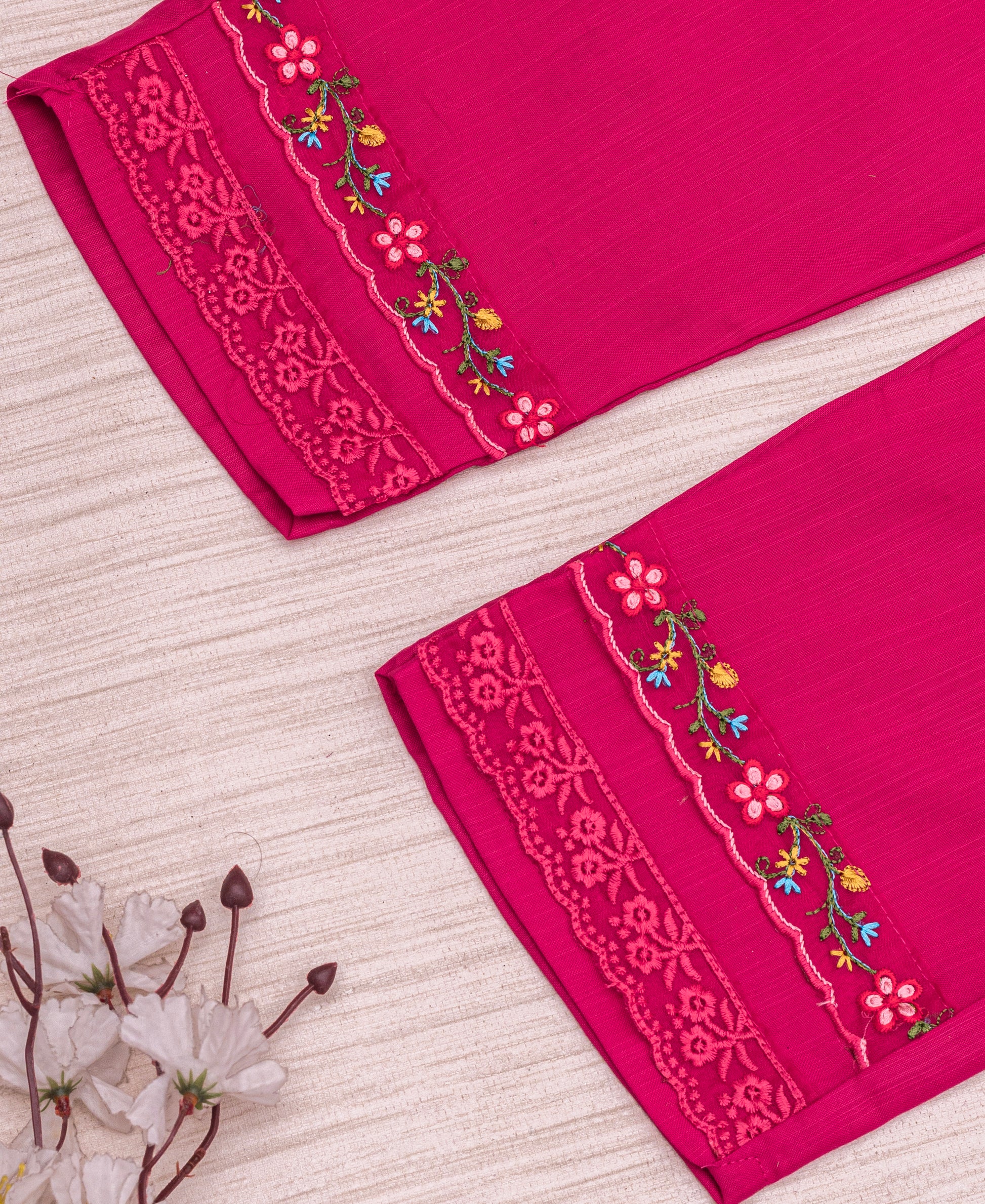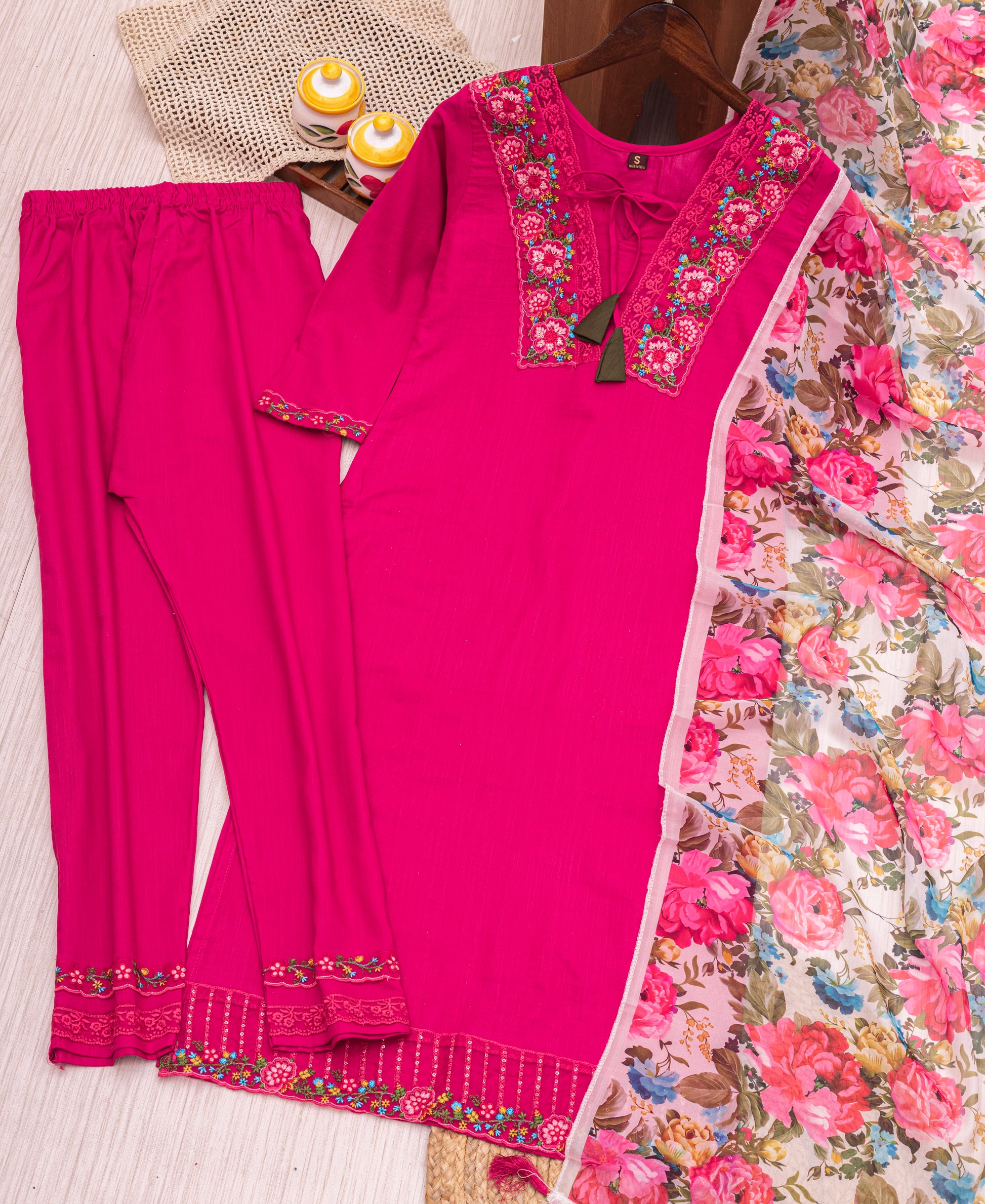 Gentle twilight meets floral finesse in this embroidered masterpiece, crafted in a breathable cotton blend. Paired with a sheer organza dupatta, it’s the perfect harmony of grace and comfort.